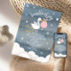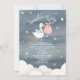 Una invitación a la ducha de bebé con un fondo de color azul oscuro inspirado en una acuarela con un texto blanco rodeado de estrellas y ilustraciones de nubes blancas y una cigüeña con manto rosa. Personaliza con detalles de tu ocasión.