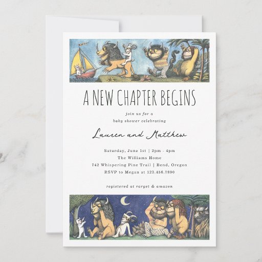 A charming storybook-inspired baby shower invitation featuring beloved scenes from Where the Wild Things Are, brought to life with playful, hand-drawn illustrations of Max and his wild companions. The design captures a sense of adventure with a whimsical sailing moment at the top and a cozy nighttime gathering below, creating a full storytelling experience across the layout. Soft neutral tones paired with expressive characters and textured details give the design a warm, nostalgic feel while still being modern and elegant. The typography blends playful and script styles, making it perfect for celebrating a little wild one on the way. Fully customizable text allows you to personalize names, date, time, and location for a truly unique and memorable invitation.