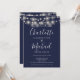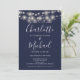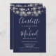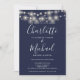 Con luces de cadena de bonito y nombres de estilo, esta elegante invitación a la boda azul marino y blanco se puede personalizar con toda la información especial del día de la boda al revés, incluyendo su RSVP, alojamiento y detalles adicionales. Diseñado por Thisisnotme©
