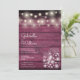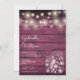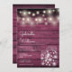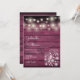 Una elegante invitación a la boda rústica con luces de cuerdas de bonito y jarras de albañil. Los nombres de la pareja feliz están en un guión elegante encima de los detalles especiales del boda sobre un fondo rústico de madera de color burdeos. El reverso presenta un fondo rústico de madera a juego. Diseñado por Thisisnotme©