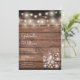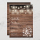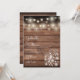 Una elegante invitación a la boda rústica con luces de cuerdas de bonito y jarras de albañil. Los nombres de la pareja feliz están en un guión elegante encima de los detalles especiales del boda sobre un fondo rústico de madera. El reverso presenta un fondo rústico de madera a juego. Diseñado por Thisisnotme©