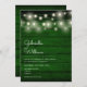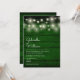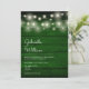 Una elegante invitación rústica para celebrar bodas con luces de cuerda sobre los nombres de la pareja, enmarcada en un elegante guión sobre los detalles especiales del boda sobre un rústico fondo de madera verde esmeralda. El reverso presenta un fondo rústico de madera a juego. Diseñado por Thisisnotme©
