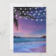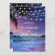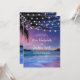 Este moderno y elegante diseño de bodas de playa de verano presenta un hermoso paisaje tropical de puesta de sol con palmeras, decorado en la parte superior con luces de cuerda. Estas invitaciones nupciales son perfectas para las bodas de destino, así como para cualquier boda de temática costera y de playa.