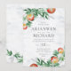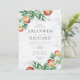 Huerto de verano abundante fruta, rústico ambiente de casa de campo con ramas cortadas de fruta. Se trata de un divertido diseño acuático de verano, con melocotones, naranjas, colores ondulados y vegetación y una delicada flor.