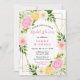 This fun and whimsical bridal shower invitation features watercolor pink, yellow and white flowers with foliage on a gold geometric frame. The text combines handwritten script and serif fonts for a stylish and modern look. This is perfect for a spring or summer rustic bridal shower.
