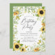 Elegantes invitaciones florales para fiestas de cumpleaños con sus detalles fiestas rodeados de girasoles acuáticos y frondosos paisajes verdes. La fiesta de cumpleaños del girasol invita a revertir a un sólido fondo verde.