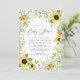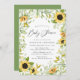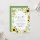 Elegantes invitaciones a la ducha de girasol con detalles de ducha rodeados de un borde de girasoles acuáticos y frondosos follajes verdes. La pequeña ducha de girasol invita a revertir a un fondo verde sólido.