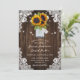 Una rústica invitación a una boda de girasoles campestres con un ramo de girasol dentro de un frasco de albañil contra un fondo de madera de granero adornado con encajes florales blancos y luces de cuerdas. Diseño de tarjetas perfecto para invitar a sus huéspedes a su fiesta de bodas de temática rústica inspirada en las flores de girasol. Diseño de personalizable completo.