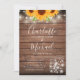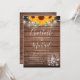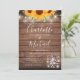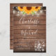 Una elegante invitación a la boda rústica con bonitos girasoles, luces de cuerdas, tarros de albañil, nombres de estilo y tipografía de moda sobre un fondo rústico de madera. El reverso presenta las iniciales de su monograma colocadas dentro de un girasol a juego. Diseñado por Thisisnotme©