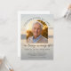 Beautiful sunset memorial photo card features easy personalization options for your loved one's picture in a modern arch frame, as well as name, date of birth/death, and celebration of life memorial details on a soft golden sunset background.