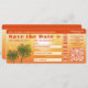 La boda de destino de Destei ahorra el diseño de la tarjeta de fecha con un tema de imitación de la tarjeta de embarque. El diseño incluye siluetas de palmeras verdes tropicales, el sol, tres siluetas de pájaros voladores y una silueta de avión. El fondo es un bonito degradado naranja que da al diseño un cálido ambiente veraniego por la noche. El diseño tiene múltiples áreas de texto personalizadas perfectas para escribir la fecha del boda, los nombres de las personas que se casan e incluso la ubicación del boda. También hay una plantilla de código QR ideal para guiar a los invitados a la página web del boda de la pareja.