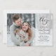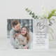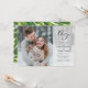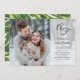Una invitación de boda con una foto de sangrado total, una superposición tipográfica que incluye sus iniciales en un monograma. Y cuenta con un hermoso diseño de fondo de follaje verde.