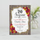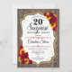 Sorpresa Invitación a los 20 Años. Diseño femenino rústico, blanco, rojo y negro con el oro falso purpurina. Presenta un patrón de madera, rosas rojas, girasoles, fuente de escritura y confeti. Perfecto para una elegante fiesta de cumpleaños. Se puede personalizar para mostrar cualquier edad. Mándame un mensaje si necesitas más personalización.