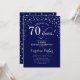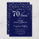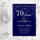 Sorpresa 70.ª Invitación a la fiesta de cumpleaños. Elegante diseño en azul marino y falsa plata purpurina. Presenta el tipo de letra de guión y los diamantes confetti. ¡Saludos a 70 años! Mándame un mensaje si necesitas más personalización.