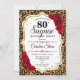 Sorpresa Invitación a los 80 Años. Diseño rojo feminista, blanco con oro falso purpurina. Presenta un patrón de cheetah de leopardo animal, rosas rojas, tipografía de guión y confeti. Perfecto para una elegante fiesta de cumpleaños. Se puede personalizar para mostrar cualquier edad. Mándame un mensaje si necesitas más personalización.
