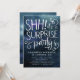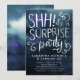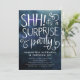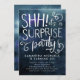 Elegante invitación de cumpleaños sorpresa para adultos con fondo de color azul marino con un texto de tipografía blanca que dice "¡SHH! es un fiesta SORPRESA" con remolinos. Personalizar esta tarjeta de plantilla agregando su propia información de fiesta.
