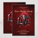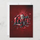 Susurros del corazón: La magia del amor y un pequeño gatito. Palabra estilizada LOVE se eleva majestuosamente en negrita, rojo, enmarcada por misteriosos contornos negros y floridos ornamentales que bailan alrededor de las letras como delicados tendrils. El fondo es de color rojo intenso, que recuerda a las bambalinas de un fuego deslumbrante, cálido y acogedor.