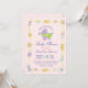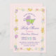 Invite a sus huéspedes con estilo con esta tarjeta de invitación llana Sweet Dreams. Tiene un adorable cochecito de bebé en el centro, de colores con rayas verdes que recuerdan a una sandía, remolinos morados y rosas que colorean las ruedas y encima de un fondo rosado. El borde de la tarjeta tiene lindos animales, corazones, globos y mariposas. La parte trasera de la tarjeta es rosa con puntos púrpura. Diseñado por la artista de renombre mundial ©Tim Coffey.