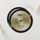 Una elegante plantilla de tarjetas de mesa boda con temática musical en forma de disco de vinilo, que presenta un fondo dorado texturado con un overlay de bola disco, tipografía elegante y caligrafía retro vintage. Una elección elegante y divertida para los músicos o amantes de la música y quieren una celebración más informal, pero elegante, boda. Perfecto para los amantes de los registros vintage, las etiquetas LP vintage y los tipos de letra del guión estilo 70.