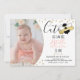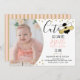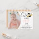 Cuidada como puede Bee la invitación de fiesta de primer cumpleaños con foto. Adorable invitación para la fiesta de cumpleaños con el tema de las abejas de burbujas para cualquier niño con un toque de brillo, confeti falso alrededor del marco curvo de la foto. Esta invitación a la fiesta de primer cumpleaños tiene un color de melocotón y de oro editable con franjas doradas en el reverso de la tarjeta, cambia los colores para coordinar con el fiesta como prefiera.