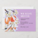 Elegante y moda nueva tarjeta de invitación móvil hogar con bellas ramas de mandarina florecientes y texto "Nos hemos movido". Tarjeta botánica floral con flores y cítricos delicados de primavera. colores naranja, pastel y lila. Añade tus nombres y dirección.