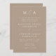 Invitación minimalista y moderna a la boda con sus iniciales de monograma y los detalles de boda mostrados en letras blancas con acentos caligráficos. El fondo Taupe se puede cambiar a un color de su elección. Diseñado para coordinar con nuestra colección de bodas Modern Elegance.