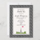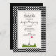 Invitación a una fiesta de novias con un tema francés. El fondo está compuesto por un lindo patrón de puntos polka blanco y negro. Un marco blanco con un borde negro sobre la parte superior. Un capricho con la Torre Eiffel al fondo rodeado de árboles verdes.