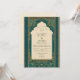 An opulent Islamic wedding design featuring a teal and gold arched frame inspired by mosque architecture and Persian artistry. With intricate floral motifs and geometric symmetry, this invitation exudes elegance, spirituality, and timeless cultural refinement — ideal for a luxurious Islamic wedding.