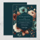 A dramatic composition of florals emerges from a deep teal background. Soft blush and ivory roses contrast beautifully with striking teal anemones and rich, coppery foliage. This elegant design creates a moody and sophisticated ambiance for a special day's union.