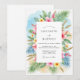 This design captures a refreshing exotic mood with a soft teal watercolor backdrop. Vibrant pink hibiscus and sunny yellow plumeria flowers are artfully arranged alongside lush green palm fronds and textured tan pampas grass. The watercolor aesthetic evokes a breezy coastal atmosphere, perfect for a romantic seaside or island event.