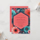 Lush botanical elements in vibrant teal and coral hues create a striking visual. The deep, dramatic background accentuates the bold floral blooms, evoking a sense of dramatic elegance. This design captures a rich, enchanting atmosphere perfect for a memorable occasion.