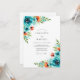 This design features a vibrant watercolor palette of teal blue and fiery orange. Large hand-painted roses in turquoise tones are accented by delicate coral anemones and lush green foliage. The artistic style creates a fresh and spirited mood for any warm-weather event. These botanical clusters provide a striking contrast against the clean white aesthetic.