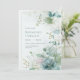 Bring the tranquil beauty of an ethereal garden to your big day with this stunning digital botanical layout. This design features a lush arrangement of translucent teal and sage green leaves, including intricate skeletal veining and soft eucalyptus sprigs. Nestled among the foliage are soft pink and ivory blossoms, their petals delicately rimmed with fine golden lines. A minimalist gold rectangular frame defines the central space, set against a clean, misty white backdrop. The high-definition textures and airy composition create a sophisticated, modern-romantic vibe for your ceremony details. This botanical frame is an impeccable choice for a modern spring or summer wedding. The cool teal and soft pink color story makes it a flawless fit for an elegant outdoor bridal shower, a refined engagement party, or a chic morning wedding reception. It pairs beautifully with wedding themes like modern organic, fine-art botanical, or minimalist romantic, and coordinates perfectly with champagne gold, slate blue, and ivory accents.