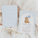Prepárate para duchar a los futuros padres con amor usando esta adorable invitación a la ducha de bebé "We Can Bearly Wait". Con un dulce oso de peluche pintado a mano que sostiene un globo azul, este diseño es perfecto para celebrar la próxima llegada de un pequeño paquete de alegría. El suave fondo azul gingham y la disposición de un arco de inspiración vintage le dan un encanto atemporal y acogedor a su evento.