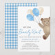 This charming baby boy's baby shower invitation features a cute watercolor teddy bear with blue and beige balloons. The back has a blue gingham check pattern. It says "We Can Bearly Wait" in stylish script calligraphy. It is easily customizable. Original Watercolor © Michele Davies.