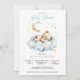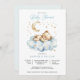 Celebrate the arrival of a little bundle of joy with a blue boy teddy bear baby shower invitation! This charming baby shower invitation features a whimsical teddy bear sleeping on a cloud, with the moon and stars above. Also, suitable for gender neutral invites. Available in print, as a digital download, or both.