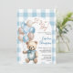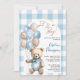 Invitación de moda para los niños de la ducha de bebé azul con adorable oso de peluche con globos pastel azules y marrones, la redacción "Es un niño" y el patrón de mantas azul pastel en el fondo. Elementos coincidentes disponibles.