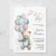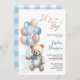 Invitación de moda para los niños de la ducha de bebé azul con adorable oso de peluche con globos pastel azules y marrones, la redacción "Es un niño" y el patrón de mantas azul pastel en el fondo. Elementos coincidentes disponibles.