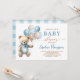 Invitación de moda para los niños de la ducha de bebé azul con adorable oso de peluche con globos pastel azules y marrones, la redacción "Es un niño" y el patrón de mantas azul pastel en el fondo. Elementos coincidentes disponibles.