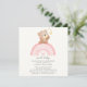 Esta adorable ducha de bebé alberga un encantador oso de peluche sentado en un colorido arco iris rosa, que crea un diseño caprichoso y alegre perfecto para celebrar la llegada de un dulce recién nacido. Los suaves colores pastel y las dulces imágenes hacen de esta invitación una deliciosa elección para un evento de ducha de bebé.