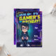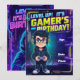 Featuring a fun cartoon gamer boy holding a glowing joystick, wearing a hoodie and headphones, set against a dynamic neon gaming background with pixel and digital effects. Perfect for a video game-themed birthday party.