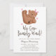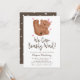 Baby shower de tema de oso lindo con ilustración pintada a mano de un cachorro con un lazo rosa y corazones. El texto dice "¡Apenas podemos esperar!" Esta invitación es ideal para el baby shower de una niña.