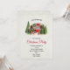 Invitación a la fiesta de Navidad con un tema navideño lindo y caprichoso. Un remolque acogedor decorado para Navidad ubicado entre nieve y pinos.