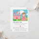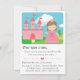 ¡Qué genial será tener un libro de cuentos dedicado a tu hija! Ese es el concepto detrás de esta invitación que es como una página arrancada de un cuento de hadas. El diseño brillante y colorido incluye una princesa adorable que lleva una corona brillante y un vestido con una cinta grande y un fleco de lunares. En algún lugar detrás, en las colinas, podemos ver un castillo rosa con corazones, nubes y árboles. Puedes organizar el cumpleaños de tu niña siguiendo las líneas de un cuento de hadas y planificar actividades y misiones para los niños invitados (que pueden venir como caballeros, princesas, príncipes) lo que hará que sea un día emocionante, divertido y memorable. Personaliza fácilmente con los detalles de tu fiesta.