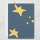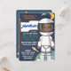 Esta divertida invitación a la fiesta temática del espacio exterior presenta un fondo azul oscuro con acentos de nubes espaciales y estrellas. A la derecha se muestra una gran imagen de un astronauta o cosmonauta lindo e ilustrado con una foto de un niño de muestra colocada dentro del casco. Puede incluir su propia foto para aparecer detrás del visor. El astronauta es fotografiado con el planeta Tierra a la distancia, y un barco con cohetes explota desde él. A lo lejos se ve una estrella de luna y tiro.