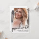 Anuncio de graduación y invitación a la fiesta minimalista simple. La parte delantera presenta una foto a página completa con "Graduado" en escritura a mano negra en la parte inferior. Debajo, el nombre del graduado, "Clase de 2026" y el nombre de la escuela se muestran sobre un sutil gradiente blanco que se desvanece perfectamente en la imagen, lo que garantiza que el texto se destaque.