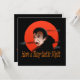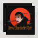 Tener una invitación Fang-Tastic de Halloween muestra a vampiro con colmillos sangrientos y sangre en sus ojos y usando una capa negra del Conde Drácula, todo contra un fondo de sangre de luna roja.