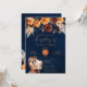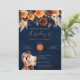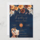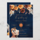 Impresionante invitación de boda con código QR moderna que presenta una pareja romántica con elementos florales boho de hierba de pampas en terracota, óxido, naranja quemada y tonos de cabaña de otoño contra un fondo azul marino. Agregue la URL de su sitio web de boda y el código QR se actualizará. Haga clic en personalizar para editar. Una invitación conveniente todo en uno sin la necesidad de agregar sobres separados.