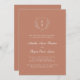 Invitación a la boda de Terracota. Esta elegante invitación a la boda incluye un escudo blanco de hojas con el monograma de la novia y el novio sobre un fondo de terracota. El texto es blanco y el fondo de la invitación es terracota. Forma parte de la colección Minimal Escudo & Leaves.