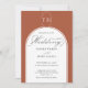 Invitación a la boda naranja quemada por Terracotta con caligrafía de escritura elegante, monograma estilo logo y marco de arco moderno. Sencilla elegancia, en terracota y blanco. En mi colección de Bodas Colors se pueden encontrar invitaciones de coordinación, papelería y decoración del día del evento. Si desea colores diferentes o plantillas adicionales para productos coincidentes, por favor envíeme un mensaje para añadirlos.